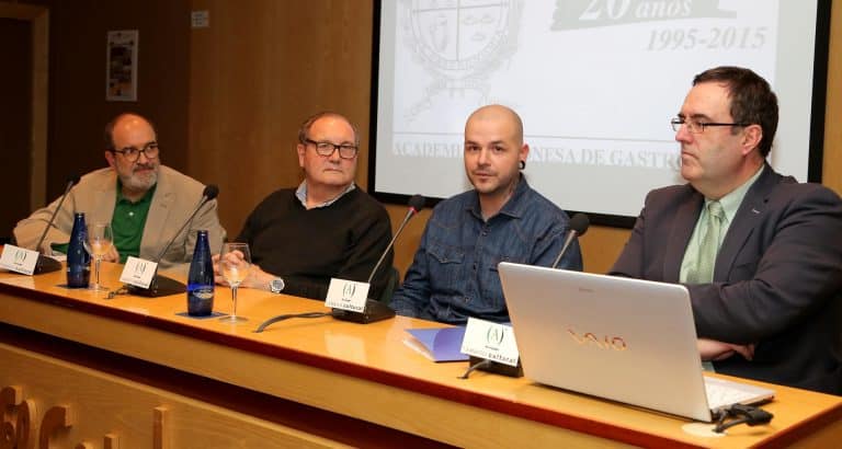 Tonino Valiente, «estrellado Michlelín» de Huesca, habló el lunes 13 de febrero sobre «La cocina de Huesca, liderazgo consolidado» y estuvo acompañado por el académico y director del Diario del Alto Aragón, Javier García Antón. La Academia Aragonesa de Gastronomía continúa con sus actividades programadas para el comienzo de este nuevo año 2017. Así el lunes 13 de febrero a las 19,30 horas en el Ámbito Cultural de El Corte Inglés, el cocinero afincado en Huesca Tonino Valiente poseedor de una estrella Michelín disertó sobre la cocina de Huesca como un liderazgo ya consolidado. Le acompañó el director del Diario del Alto Aragón y también académico Javier García Antón. Gregorio Abadía de Fraga, Javier Turmo de Benasque y Toño Rodríguez de Biescas, entre otros, ya han confirmado su participación en esta iniciativa compartida con El Corte Inglés con quien mantiene la colaboración un año más y de manera ininterrumpida desde el año 2008. SOBRE TONINO VALIENTE: Tonino Valiente,original de Badalona, lleva desde 1994vistiendo chaquetilla y desde 2012, la luce en Huesca y de qué manera. A los dos años de haber abierto el Tatau Bistró, consiguió una estrella MichelIn y lo que para él es todavía mejor, que haya gente que llegue desde Madrid o EE.UU, con la guía debajo del brazo, para comer en su casa. Con la capital oscense le une un vínculo muy especial, su pareja, Arancha Sainz. Pero también se siente atraído por una cultura gastronómica que le sorprendió. “He vivido en un montón de sitios, y Huesca me llama la atención porque la afición por la gastronomía se vive cada día, no solo el fin de semana”. “Yo era el típico niño gordito al que le encantaba comer y que no era muy buen estudiante, mis padres me dijeron que si era la cocina lo que me gustaba, que estudiara”. Pero en esos tiempos en Barcelona no había escuelas públicas y su familia no podía permitirse las escuelas privadas. Hizo un pequeño curso y trabajando en la Costa Brava, se enganchó a la cocina. Tras esa primera incursión, estudió en la prestigiosaEscuela de Hostelería Hoffman. “Mientras estuve ahí, hice prácticas con Berasategui, con Koldo Royo, con el que fue el jefe de cocina del Bulli,Christian Lutaud…”. También viajó por Brasil, Italia y Francia y a los veinticuatro años,empezó a trabajar con Carles Gaig, un referente de la cocina catalana y un maestro para Tonino. Estuvo seis años en su casa y allí se hizo cocinero. A los dos años, los inspectores de Michelin le concedieron la preciada estrella. “Al principio fue polémica. La gente no entendía que hubieran dado una estrella a un bar en el que hay música punk y se come en banquetas, fuimos trending topic, pero la gente nos conoció y ahora son todo buenas críticas y colas para entrar los fines de semana”. Con las bases de la clásica gastronomía catalana, Tonino es un cocinero de fondos y elaboradas salsas y es esa la cocina que practica, adaptándola al formato de bar. “Me gusta la restauración clásica, cuanto más rococó mejor, yo cruzo el Pirineo para ir a los restaurantes franceses y disfruto más que yendo a Mugaritz”.El “mar y montaña” para él es “fetichismo puro”, le encanta la casquería, la verdura de la huerta aragonesa, los guisos a fuego lento y el pescado de su costa. “En el Tatau servimos lo que a nosotros nos gustaría encontrar en un bar”. |