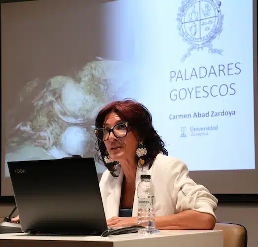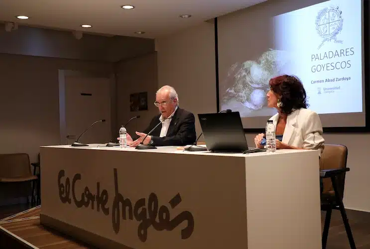 La Academia Aragonesa de Gastronomía hace su contribución a las actividades de la VIII Semana Goya en el Ámbito Cultural del Corte Inglés de Zaragoza a través de la conferencia “Paladares Goyescos” impartida por Carmen Abad, académica y profesora de la Universidad de Zaragoza, que estuvo acompañada por Ernesto Fabre, presidente de la Academia.